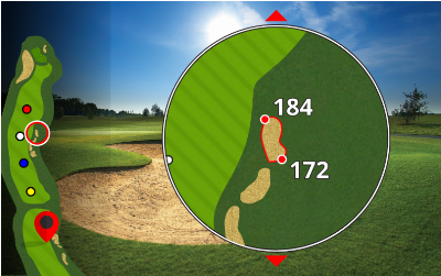 ファインダー内のコースマップ上にバンカーなど各ハザードの、フロント&バックエッジまでの2カ所の距離を同時に表示。