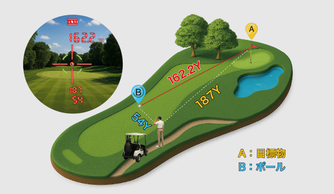 ボール地点に行かなくても、 カートなどの離れた場所からボールから目標物までの距離計測が可能の3点間距離計測機能を搭載